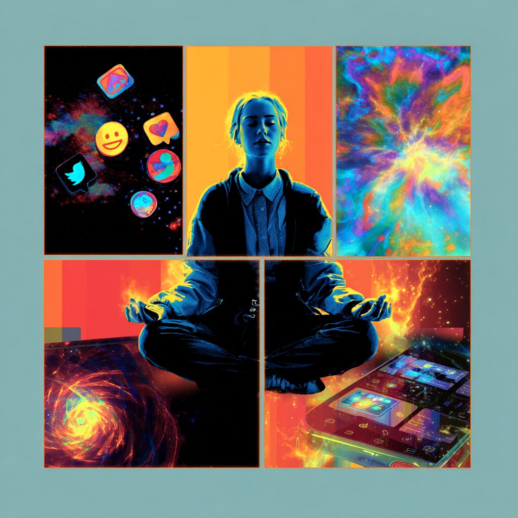 Neon Enlightenment asks a profound question: can awareness exist in a world flooded by notifications? The work glows with emojis, cosmic patterns, and mindfulness symbols, bridging spirituality and digital chaos.