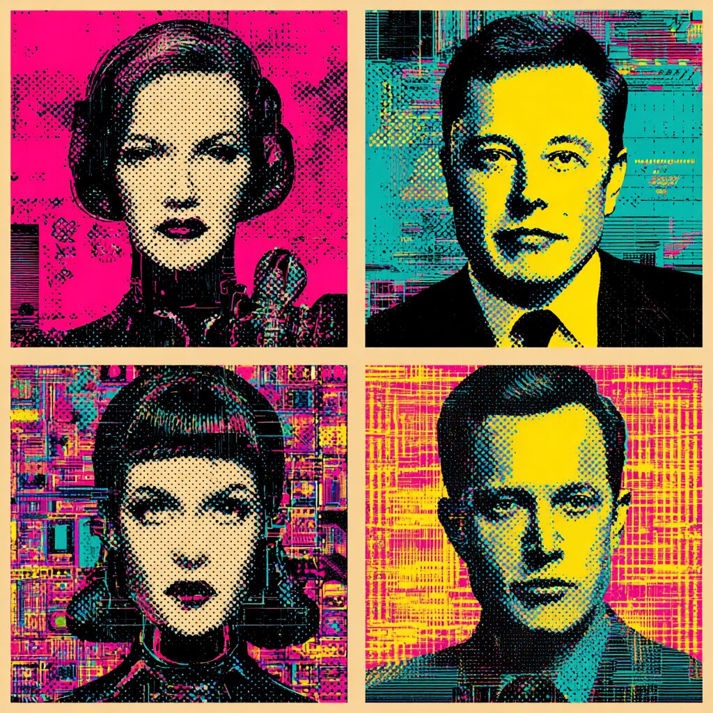 In AI Icons in Warhol’s Neon Grid, the new celebrities aren’t actors or rock stars — they’re machines. Musk, ChatGPT, and humanoid robots shimmer in fluorescent panels, representing how artificial intelligence has become the new face of fame.